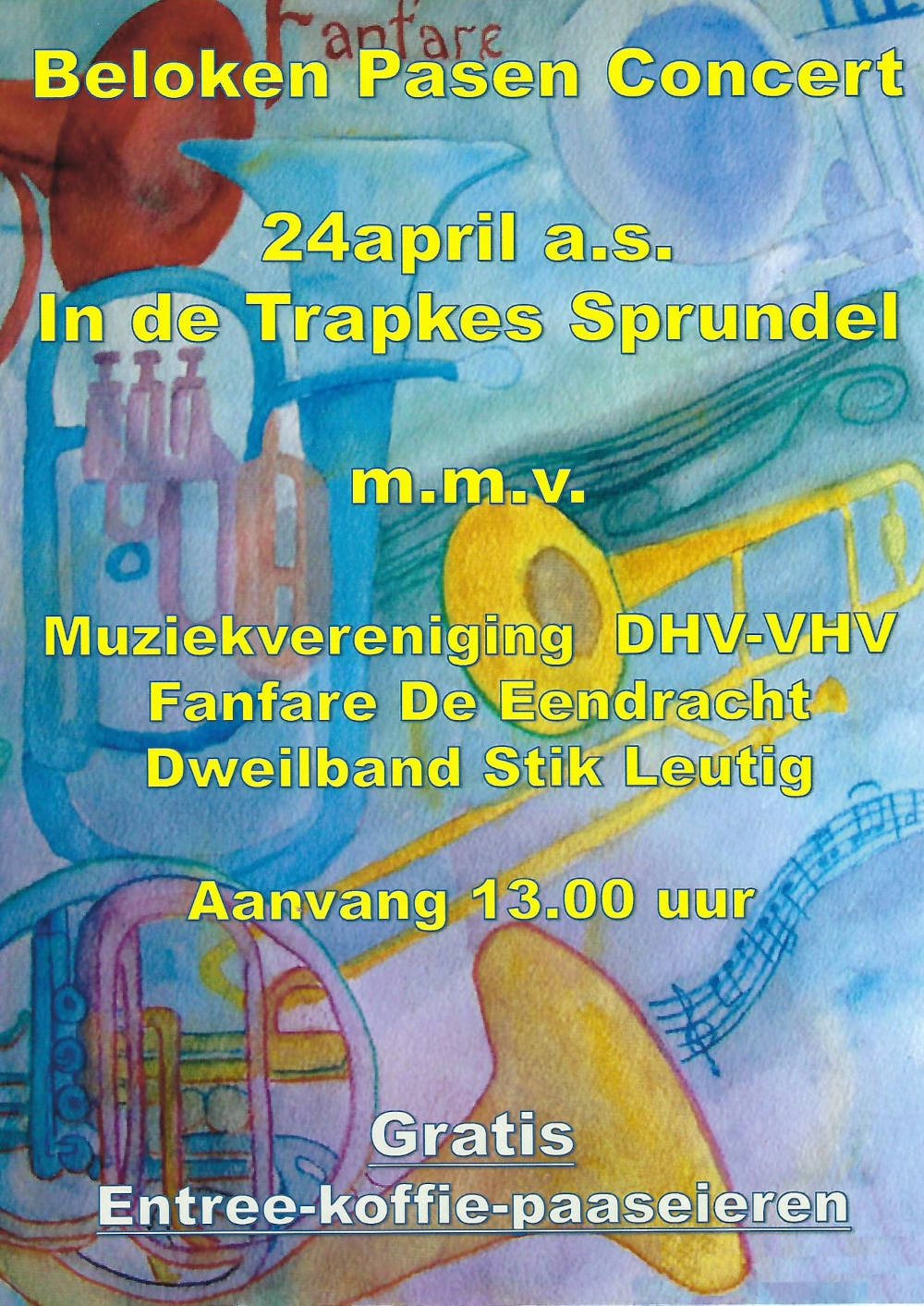 Op zondag 24 april is er in De Trapkes een populair concert. Dat wordt verzorgd door muziekvereniging Door Het Volk Voor Het Volk uit Sprundel en fanfare De Eendracht en dweilkapel Stik Leutig uit St. Willebrord. Ook zullen de majorette van de Sprundelse muziekvereniging optreden.