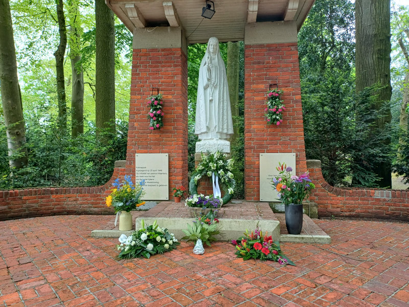 De bloemen die toen bij het beeld van St. Jan neergelegd zijn, hebben 5 mei een plaats gekregen bij het oorlogsmonument in het Fatimapark.