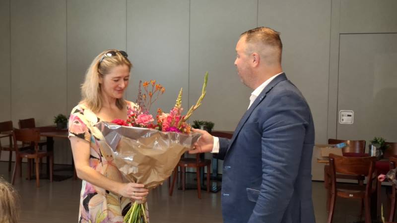 Wethouder Martijn Gijzen zette de acht vrijwilligers die vijf jaar zwerfvuil ruimen in de bloemen.