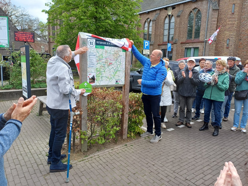 Wethouder René Lazeroms en Jac van Trijp, van Beleef Sprundel, openden Tweede Paasdag fietsknooppunt 93. Tegelijk stelden zij de vernieuwde fietsroute Typisch Sprundel in