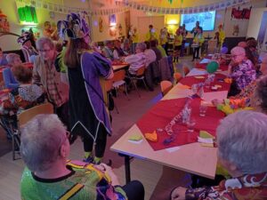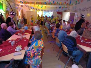 De senioren-nachtuilen hadden het zondagmiddag in De Trapkes geweldig naar hun zin. 46 hadden zich aangemeld voor een carnavals brunch. Vrijwilligers, waaronder wethouder Breedveld, bezorgden hen een heerlijke maaltijd.