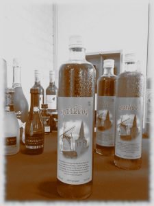 Di gieng onze vurzitter Adrie van Gieneke zwaor aon ´t hart en hij von dan wóók da di gemis rechtgezet moes worre en vroeg aon mèèn: “Kees kunde gij us kèèke nor de meugelijkèd vur ’n nuuw Sprundels drangeske”. Ikke aon de slag en docht bij m’n èège: ik stel mar ne commissie saome want da doet de gemjéénte wóók altij as er iets uitgezocht mot worre. Ikke dus op zoek nor mèèse mee kennis van zaoke. Allerjirst Dineke van de Cwoop, grwóót geworre in ’t café, zij moes zùrge vur de jiste verkennienge waor drankskes gemaokt worre en vur de bestellieng van de borrelglaskes. Dan Bart de Jong mediavormgééver/staigér bij de Trapkes as ontwerper van ´t etiket. Vur ’n goeie gezaomenlijke foto van de meûle en de kerktòòre éét ie zelfs de ljéér van Jos Lazeroms geljéénd om vanuit de wóógte de goei foto te kunnen maoke. Wóók moes ik nog n’n goeie pruuver emme. Ikke zelf lust wóók wel ’n borreltje, mar aljéén pruuve is mar aljéén. Toen docht ik aon Ad van Harrie van Driek Vergouwen, want as ik die aon de twóóg zie staon om iets te pruuve, dan is ´t altij van MMMMM lekker. Hoe langer hij MMMMMMM zegt oe lekkerder dattie ’t vindt. We maokte un afspraok in Tilburg om te gaon pruuve en ge kunt ´t al raoie: n’n extra lange MMMMMMMMMM aongevuld mee klasse inplaots van lekker. Dus ik docht, di mot goed zen. Wóók omdat ´t ’n uniek drangeske is da nog nie te kwóóp is. De tekst op ´t etiket luidt dan wóók: SPRUNDELÈRKE……een kruiig bitterlikurke op baosis van ´n biezonder kruiedistillaot. ´t rèèke en aparte karakter wóór verkréége dur de speciaole mengelieng van koriaander, kruidnaogel en anèès. De smaok is zacht meej ´n licht bittere afdronk. Ervaor ´t genoege van di biezondere drangeske.